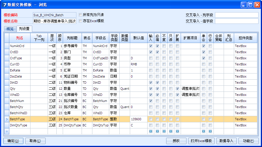 3.        “列设置”页按下图设置:注意层次、表名的选择。含有批次的凭证导入,一定要包括以下字段“BatchNum批号”“BatchQty批次数量”“BatchWhsID批次对应的仓库”“BatchType批次来源的凭证对象号”“DimQtyType入批次或是出批次”。其中DimQtyType字段可能四个值: A在订批次、B预约批次、C增加批次库存、D减少批次库存。