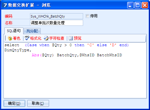 5.        下图列出了“数据交换扩展”的设置,意义是“当Qty字段为正数时,DimQtyType自动取值为C(入批次),否则DimQtyType自动取值为D(出批次);同时,将Qty字段转换成BatchQty,将WhsID字段转换成BatchWhsID”。