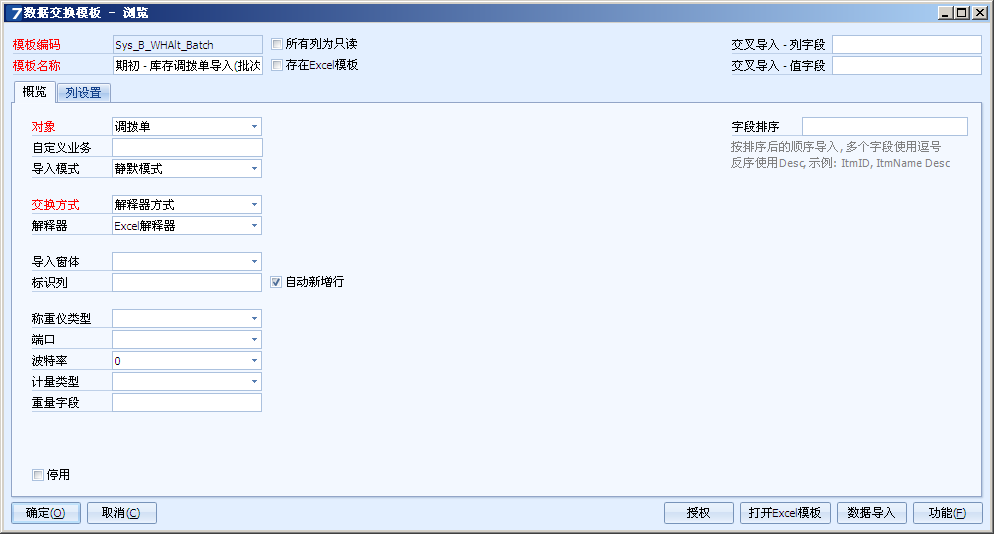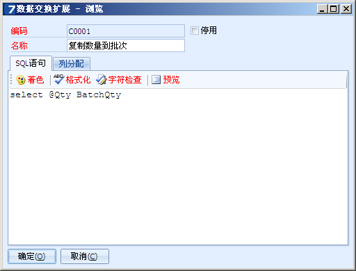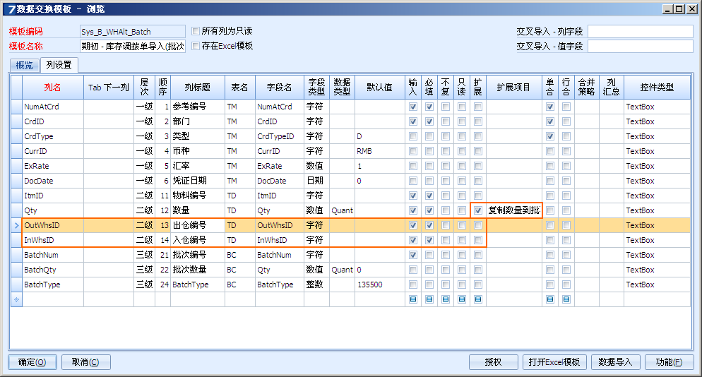 3.        “列设置”页:将WhsID换成OutWhsIDInWhsID,不需要BatchWhsIDDimQtyType.扩展中也不需要对BatchWhsID赋值。程序会自动处理仓库及其方向。